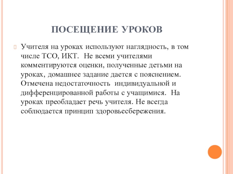 всеми учителями комментируются оценки, полученные детьми на уроках, домашнее задание дается с пояснением. Отмечена недостаточность индивидуальной и дифференцированной работы с учащимися. На уроках преобладает речь учителя. Не всегда соблюдается принцип здоровьесбережения.