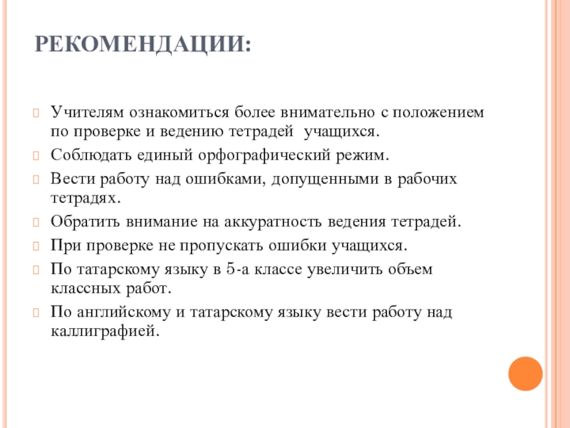 Проверка рабочих тетрадей показала, что тетради учащихся 5-х классов по татарскому и английскому языку проверяются регулярно. Однако при подписывании нужно обратить внимание на соблюдение ЕОР. Так же нужно вести систематическую работу над каллиграфией. У учащихся 5-х класса плохо сформированы навыки ведения тетрадей, учителям-предметникам предстоит вести целенаправленную работу по этому аспекту деятельности.