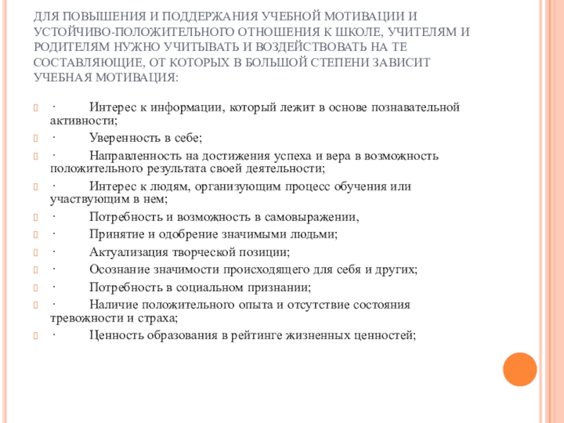 Слайд 25ДЛЯ ПОВЫШЕНИЯ И ПОДДЕРЖАНИЯ УЧЕБНОЙ МОТИВАЦИИ И УСТОЙЧИВО-ПОЛОЖИТЕЛЬНОГО ОТНОШЕНИЯ К ШКОЛЕ,