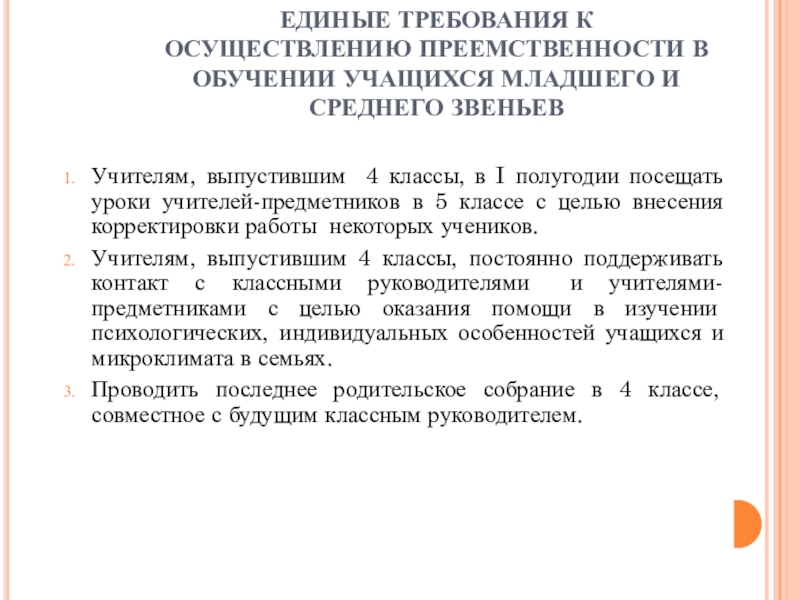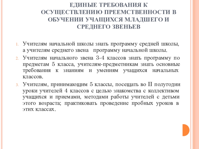 Слайд 18ЕДИНЫЕ ТРЕБОВАНИЯ К ОСУЩЕСТВЛЕНИЮ ПРЕЕМСТВЕННОСТИ В ОБУЧЕНИИ УЧАЩИХСЯ МЛАДШЕГО И СРЕДНЕГО