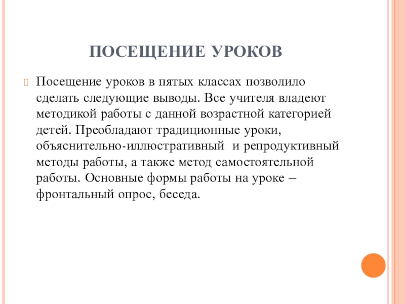 учителя владеют методикой работы с данной возрастной категорией детей. Преобладают традиционные уроки, объяснительно-иллюстративный и репродуктивный методы работы, а также метод самостоятельной работы. Основные формы работы на уроке – фронтальный опрос, беседа.