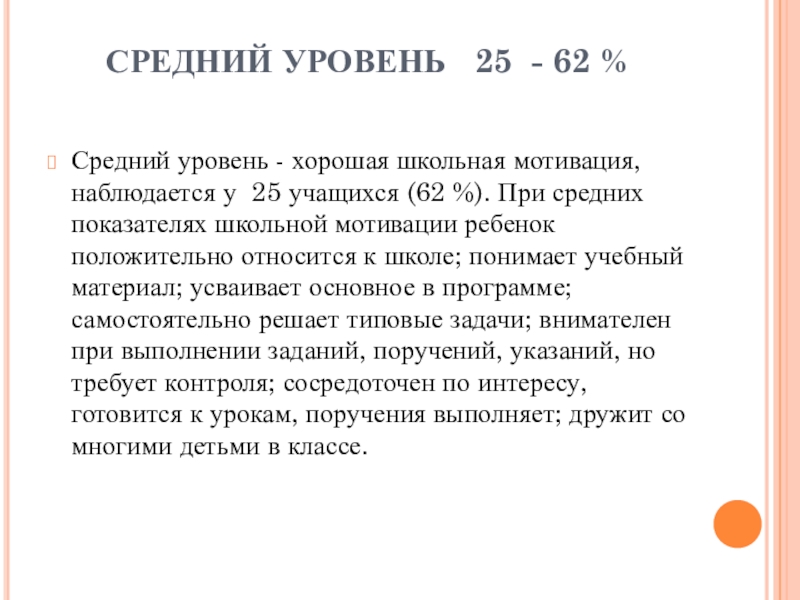 наблюдается у 25 учащихся (62 %). При средних показателях школьной мотивации ребенок положительно относится к школе; понимает учебный материал; усваивает основное в программе; самостоятельно решает типовые задачи; внимателен при выполнении заданий, поручений, указаний, но требует контроля; сосредоточен по интересу, готовится к урокам, поручения выполняет; дружит со многими детьми в классе.