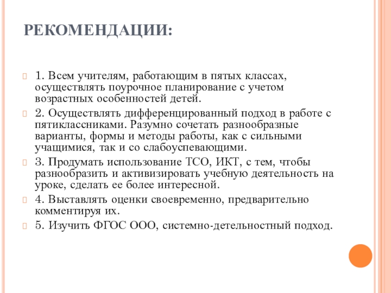2. Осуществлять дифференцированный подход в работе с пятиклассниками. Разумно сочетать разнообразные варианты, формы и методы работы, как с сильными учащимися, так и со слабоуспевающими.