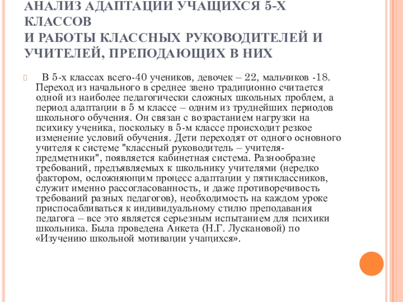 Слайд 19АНАЛИЗ АДАПТАЦИИ УЧАЩИХСЯ 5-Х КЛАССОВ