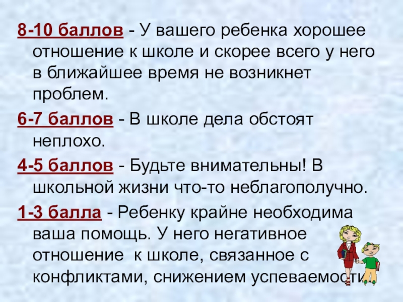 1-3 балла - Ребенку крайне необходима ваша помощь. У него негативное отношение к школе, связанное с конфликтами, снижением успеваемости.