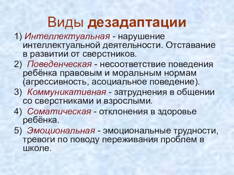 5) Эмоциональная - эмоциональные трудности, тревоги по поводу переживания проблем в школе.