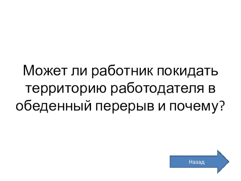 Слайд 20Может ли работник покидать территорию работодателя в обеденный перерыв и почему?