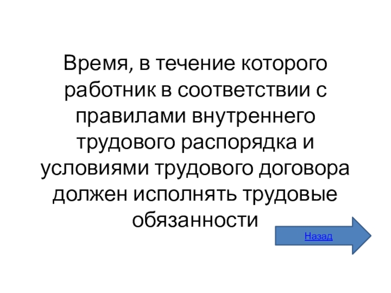 Время, в течение которого работник в соответствии с правилами внутреннего трудового распорядка и условиями трудового договора должен исполнять трудовые обязанностиНазад