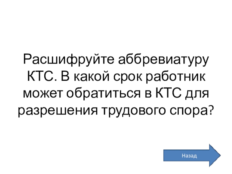Слайд 27Расшифруйте аббревиатуру КТС. В какой срок работник может обратиться в КТС