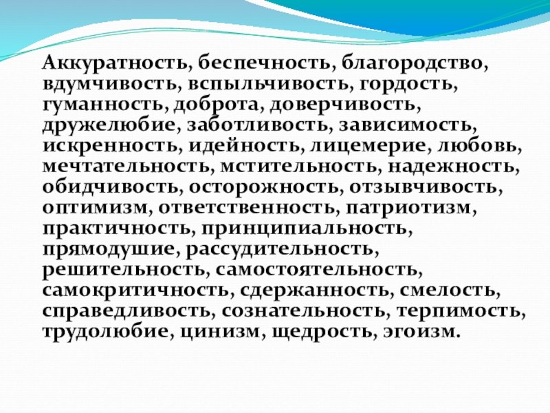 Слайд 17Аккуратность, беспечность, благородство, вдумчивость, вспыльчивость, гордость, гуманность, доброта, доверчивость, дружелюбие, заботливость,