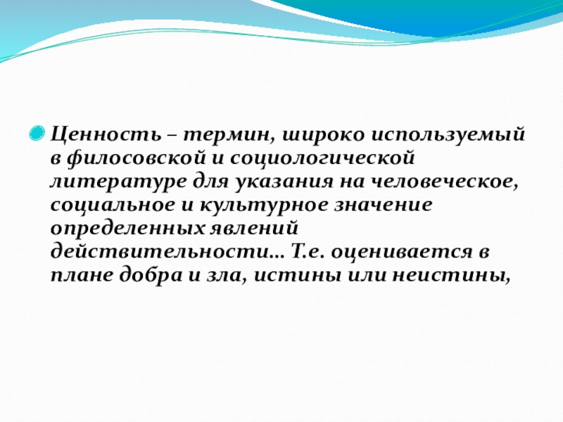 Слайд 13Ценность – термин, широко используемый в филосовской и социологической литературе для