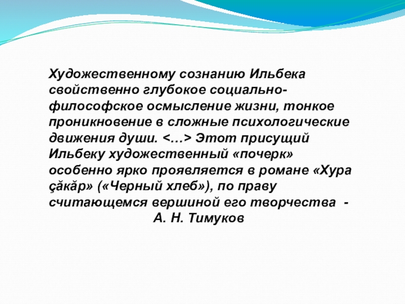 сложные психологические движения души. <…> Этот присущий Ильбеку художественный «почерк» особенно ярко проявляется в романе «Хура çăкăр» («Черный хлеб»), по праву считающемся вершиной его творчества - А. Н. Тимуков