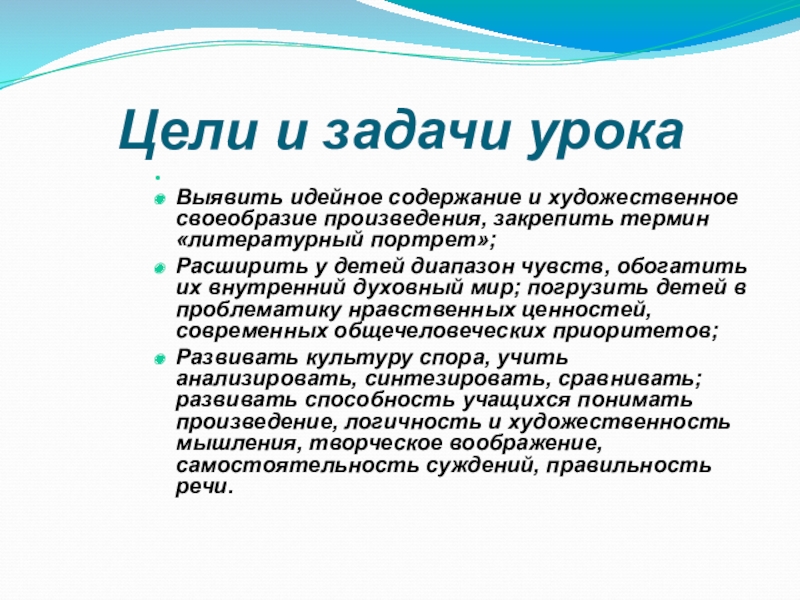 Выявить идейное содержание и художественное своеобразие произведения, закрепить термин «литературный портрет»;