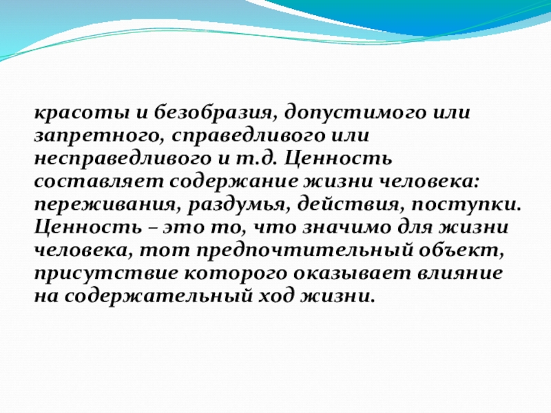 Ценность составляет содержание жизни человека: переживания, раздумья, действия, поступки. Ценность – это то, что значимо для жизни человека, тот предпочтительный объект, присутствие которого оказывает влияние на содержательный ход жизни.