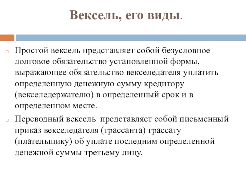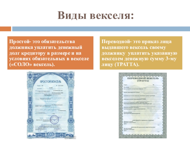 Переводной- это приказ лица выдавшего вексель своему должнику уплатить указанную векселем денежную сумму 3-му лицу (ТРАТТА).