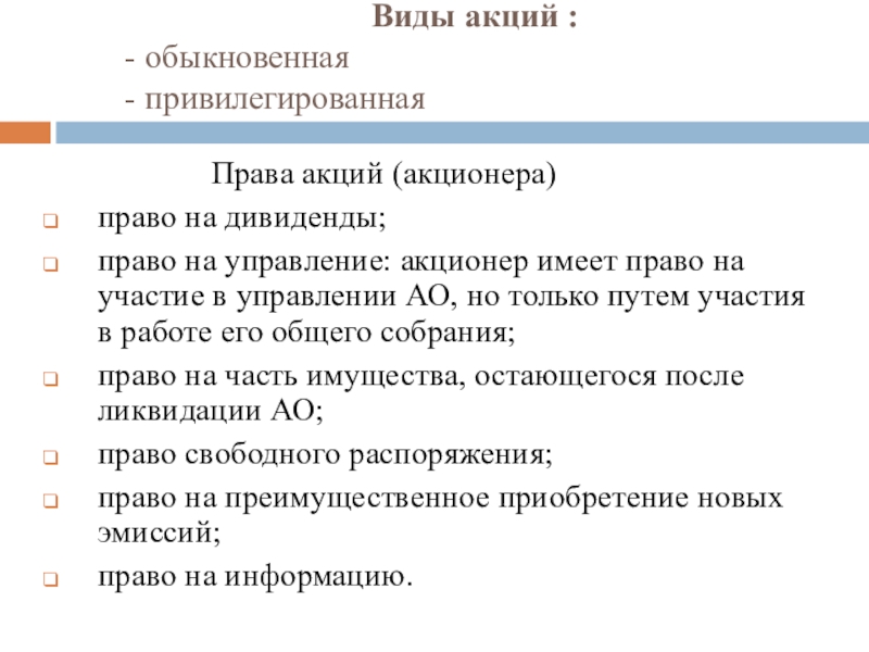 право на управление: акционер имеет право на участие в управлении АО, но только путем участия в работе его общего собрания;