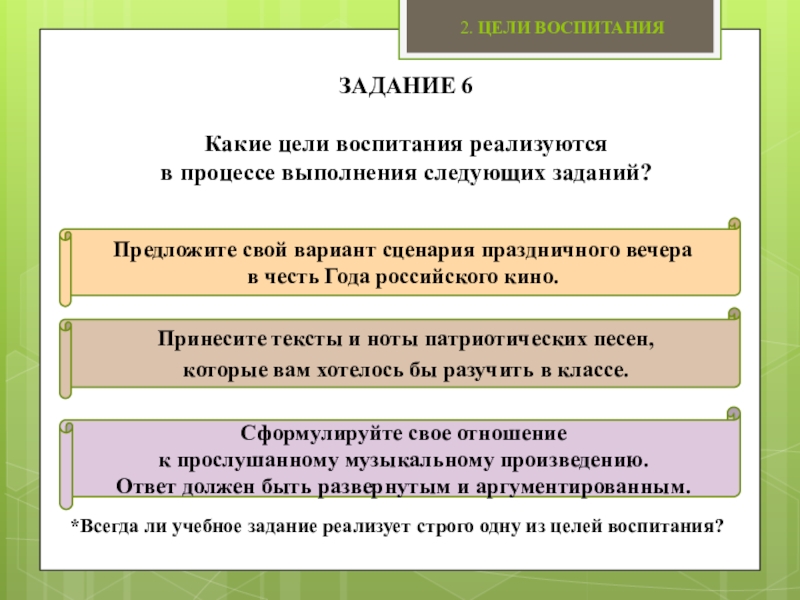 *Всегда ли учебное задание реализует строго одну из целей воспитания?