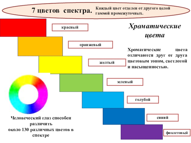 Хроматические цвета отличаются друг от друга цветовым тоном, светлотой и насыщенностью.
