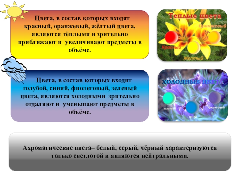 Цвета, в состав которых входят голубой, синий, фиолетовый, зеленый цвета, являются холодными зрительно отдаляют и уменьшают предметы в объёме.
