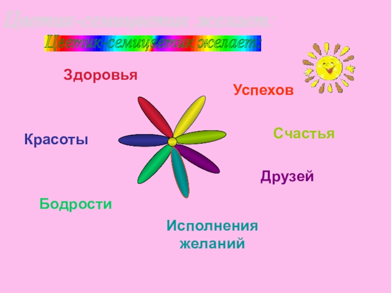БодростиЗдоровьяУспеховСчастьяДрузейИсполнения желанийКрасотыЦветик-семицветик желает: