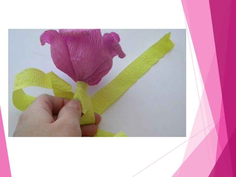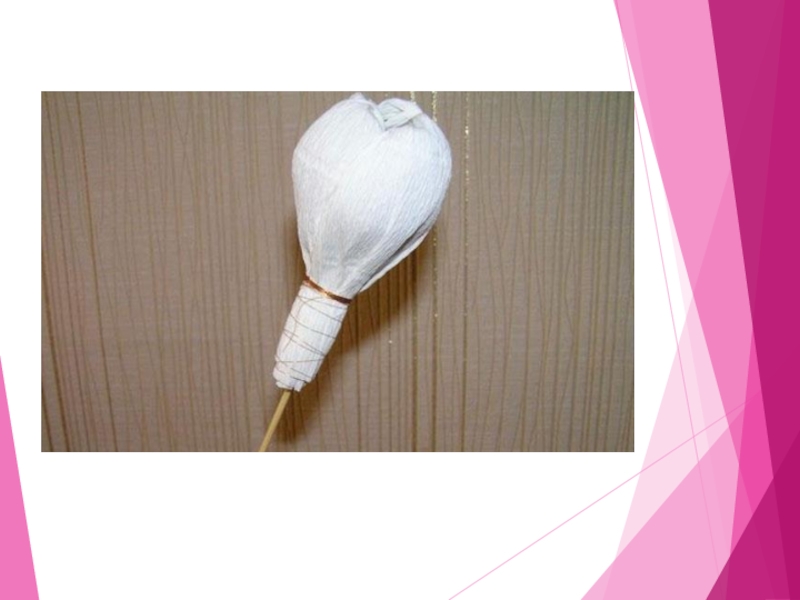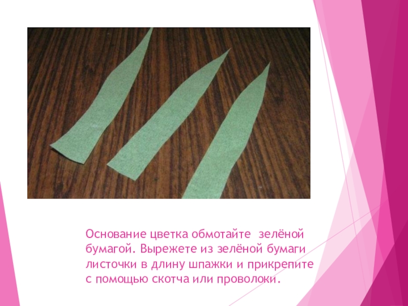 Слайд 31Основание цветка обмотайте зелёной бумагой. Вырежете из зелёной бумаги листочки в