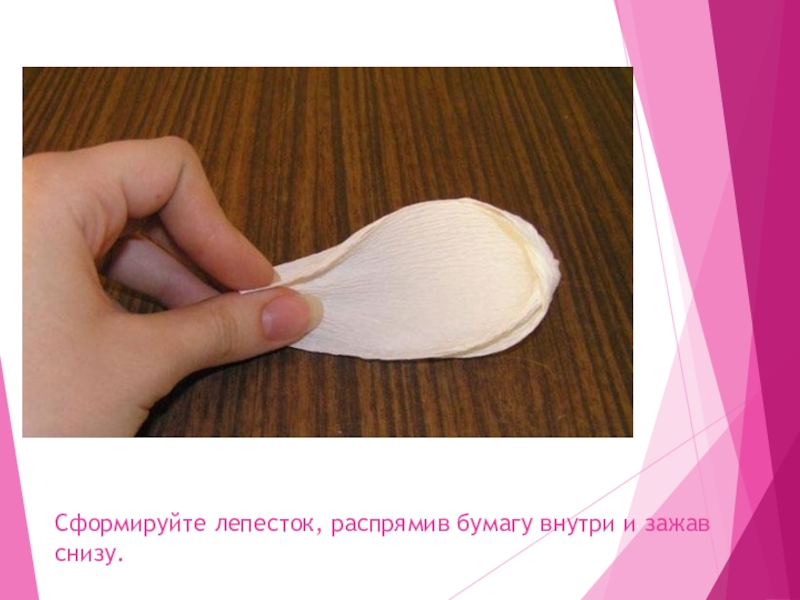 Слайд 27Сформируйте лепесток, распрямив бумагу внутри и зажав снизу.