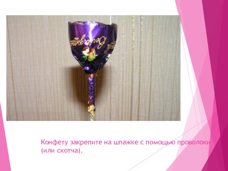 Слайд 28Конфету закрепите на шпажке с помощью проволоки(или скотча).