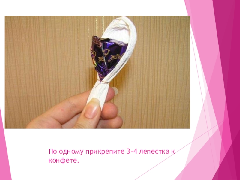 Слайд 29По одному прикрепите 3-4 лепестка к конфете.