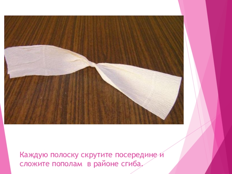 Слайд 26Каждую полоску скрутите посередине и сложите пополам в районе сгиба.