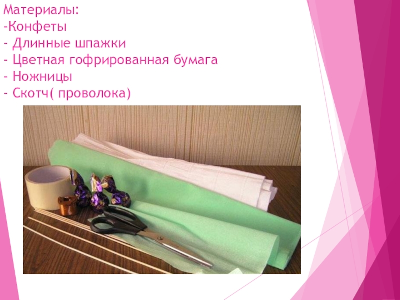 Слайд 24Материалы: -Конфеты - Длинные шпажки - Цветная гофрированная бумага - Ножницы - Скотч( проволока)