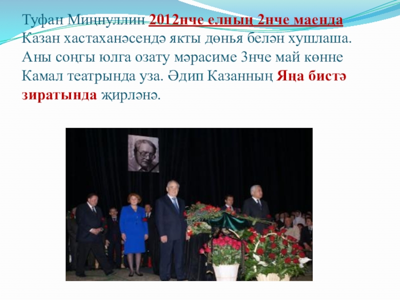 Слайд 25Туфан Миңнуллин 2012нче елның 2нче маенда Казан хастаханәсендә якты дөнья белән