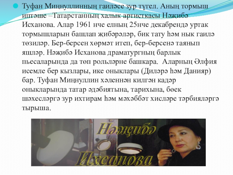 Слайд 7Туфан Миңнуллинның гаиләсе зур түгел. Аның тормыш иптәше –Татарстанның халык артисткасы