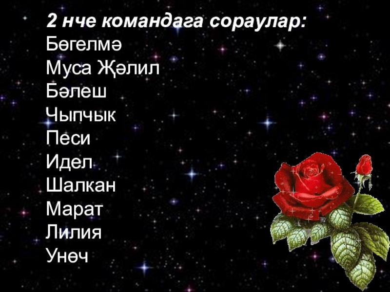 2 нче командага сораулар: Бөгелмә Муса Җәлил Бәлеш Чыпчык Песи ИделШалканМаратЛилияУнөч