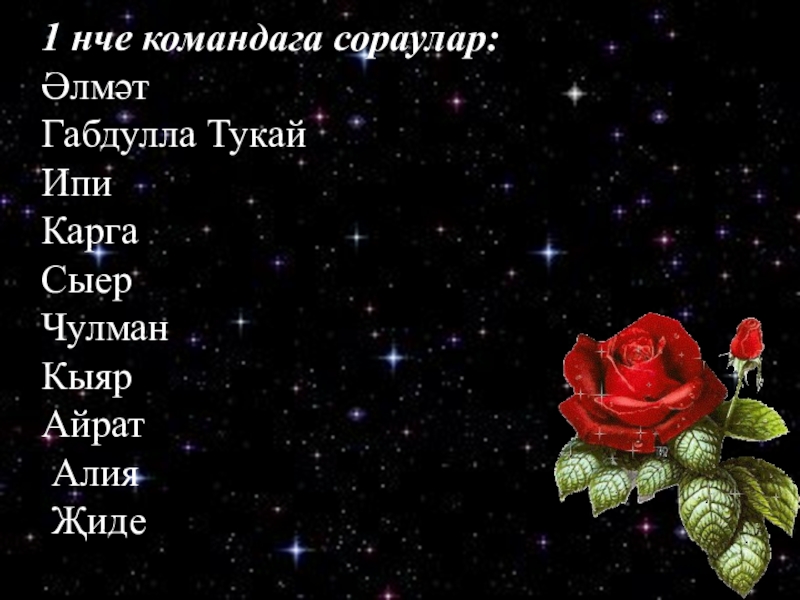 1 нче командага сораулар: ӘлмәтГабдулла ТукайИпиКаргаСыерЧулманКыярАйрат Алия Җиде
