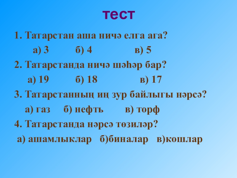 тест1. Татарстан аша ничә елга ага?    а) 3     б) 4