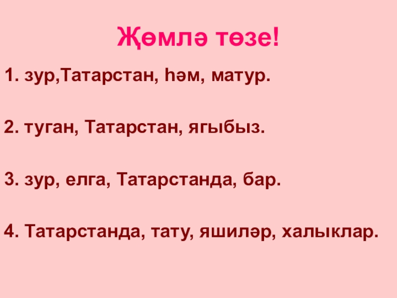 Җөмлә төзе!1. зур,Татарстан, һәм, матур.2. туган, Татарстан, ягыбыз.3. зур, елга, Татарстанда, бар.4. Татарстанда, тату, яшиләр, халыклар.