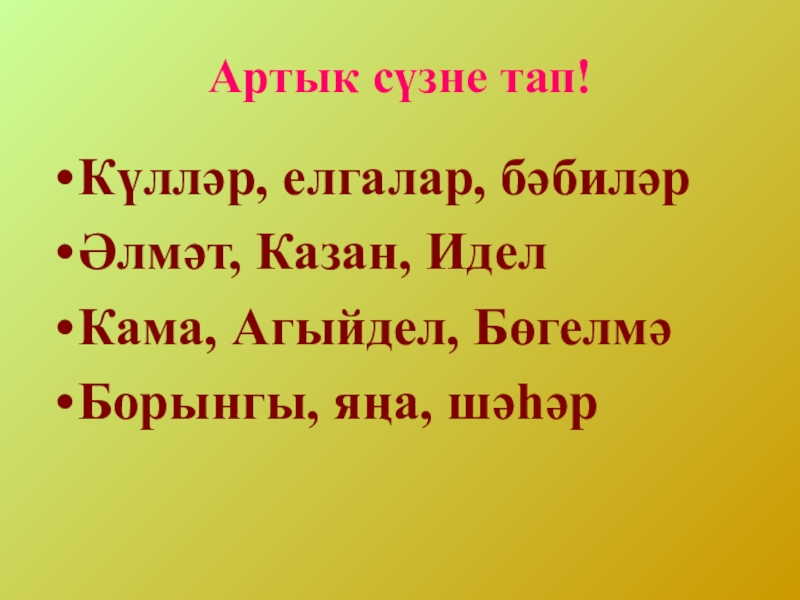 Артык сүзне тап!Күлләр, елгалар, бәбиләрӘлмәт, Казан, ИделКама, Агыйдел, БөгелмәБорынгы, яңа, шәһәр