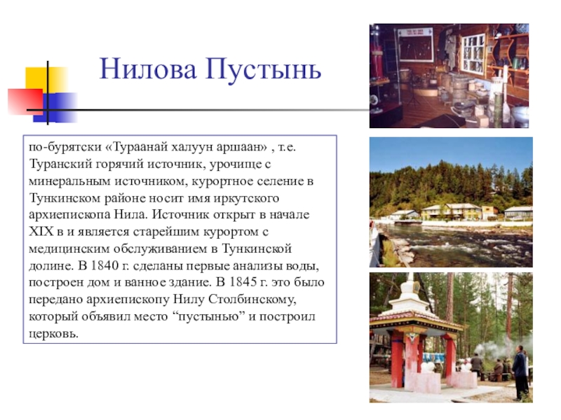 с минеральным источником, курортное селение в Тункинском районе носит имя иркутского архиепископа Нила. Источник открыт в начале ХIХ в и является старейшим курортом с медицинским обслуживанием в Тункинской долине. В 1840 г. сделаны первые анализы воды, построен дом и ванное здание. В 1845 г. это было передано архиепископу Нилу Столбинскому, который объявил место “пустынью” и построил церковь.