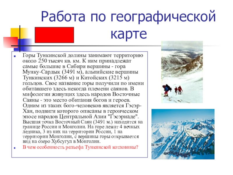 Тункинского национального парка, выявить особенности рельефа и климата, водных ресурсов, растительного и животного мира, развития животноводства в Тункинской долине.