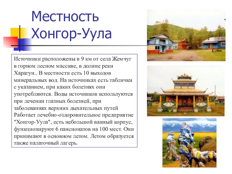 лесном массиве, в долине реки Харагун.. В местности есть 10 выходов минеральных вод. На источниках есть таблички с указанием, при каких болезнях они употребляются. Воды источников используются при лечении глазных болезней, при заболеваниях верхних дыхательных путей Работает лечебно-оздоровительное предприятие "Хонгор-Уула", есть небольшой ванный корпус, функционируют 6 пансионатов на 100 мест. Они принимают в основном летом. Летом образуется также палаточный лагерь.