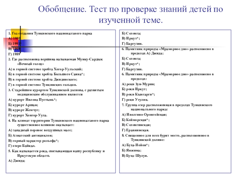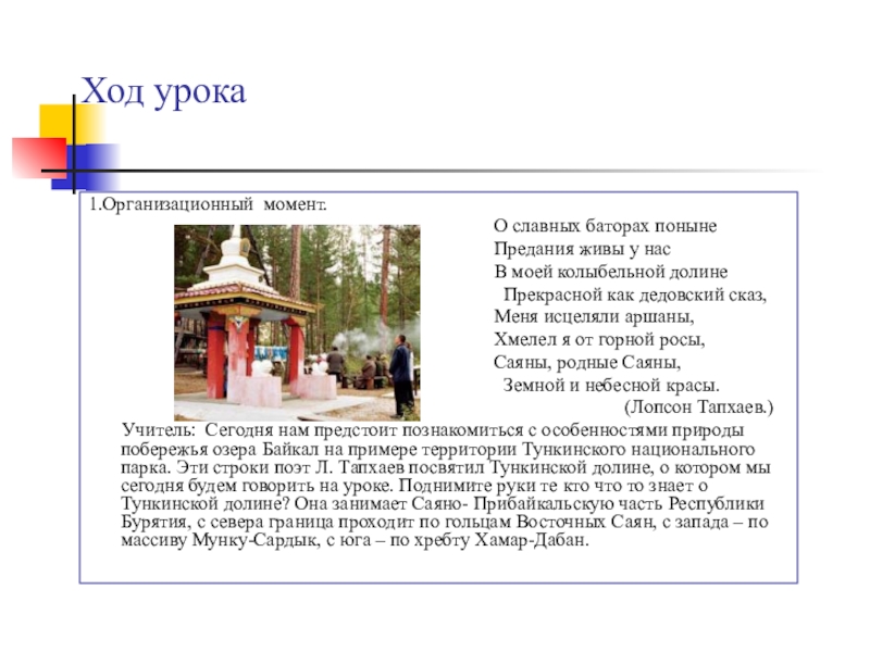Учитель: Сегодня нам предстоит познакомиться с особенностями природы побережья озера Байкал на примере территории Тункинского национального парка. Эти строки поэт Л. Тапхаев посвятил Тункинской долине, о котором мы сегодня будем говорить на уроке. Поднимите руки те кто что то знает о Тункинской долине? Она занимает Саяно- Прибайкальскую часть Республики Бурятия, с севера граница проходит по гольцам Восточных Саян, с запада – по массиву Мунку-Сардык, с юга – по хребту Хамар-Дабан.