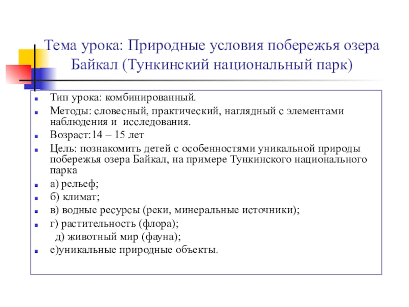 Слайд 2Тема урока: Природные условия побережья озера Байкал (Тункинский национальный парк)