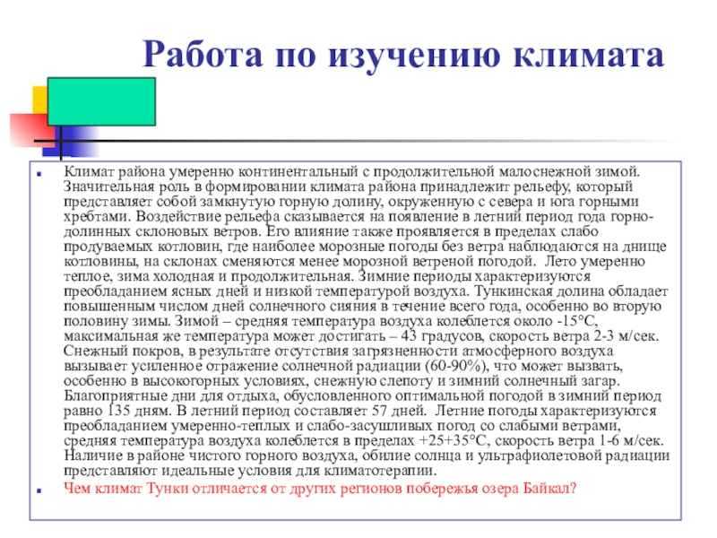 продолжительной малоснежной зимой. Значительная роль в формировании климата района принадлежит рельефу, который представляет собой замкнутую горную долину, окруженную с севера и юга горными хребтами. Воздействие рельефа сказывается на появление в летний период года горно-долинных склоновых ветров. Его влияние также проявляется в пределах слабо продуваемых котловин, где наиболее морозные погоды без ветра наблюдаются на днище котловины, на склонах сменяются менее морозной ветреной погодой. Лето умеренно теплое, зима холодная и продолжительная. Зимние периоды характеризуются преобладанием ясных дней и низкой температурой воздуха. Тункинская долина обладает повышенным числом дней солнечного сияния в течение всего года, особенно во вторую половину зимы. Зимой – средняя температура воздуха колеблется около -15°С, максимальная же температура может достигать – 43 градусов, скорость ветра 2-3 м/сек. Снежный покров, в результате отсутствия загрязненности атмосферного воздуха вызывает усиленное отражение солнечной радиации (60-90%), что может вызвать, особенно в высокогорных условиях, снежную слепоту и зимний солнечный загар. Благоприятные дни для отдыха, обусловленного оптимальной погодой в зимний период равно 135 дням. В летний период составляет 57 дней. Летние погоды характеризуются преобладанием умеренно-теплых и слабо-засушливых погод со слабыми ветрами, средняя температура воздуха колеблется в пределах +25+35°С, скорость ветра 1-6 м/сек. Наличие в районе чистого горного воздуха, обилие солнца и ультрафиолетовой радиации представляют идеальные условия для климатотерапии.