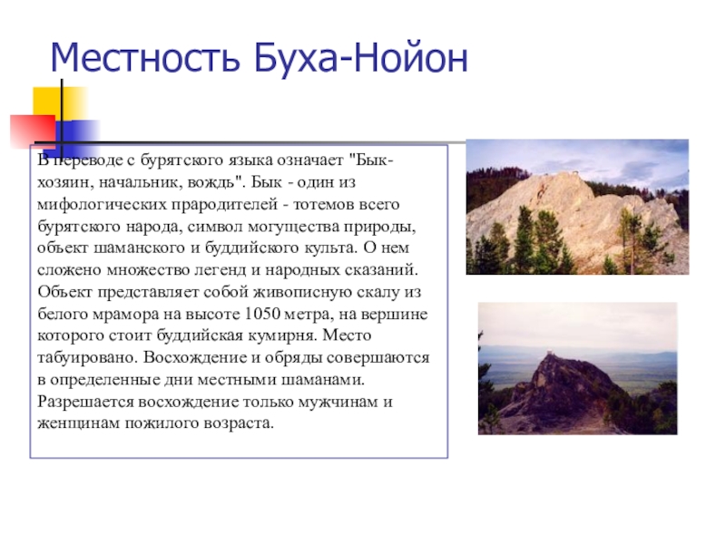 - один из мифологических прародителей - тотемов всего бурятского народа, символ могущества природы, объект шаманского и буддийского культа. О нем сложено множество легенд и народных сказаний. Объект представляет собой живописную скалу из белого мрамора на высоте 1050 метра, на вершине которого стоит буддийская кумирня. Место табуировано. Восхождение и обряды совершаются в определенные дни местными шаманами. Разрешается восхождение только мужчинам и женщинам пожилого возраста.