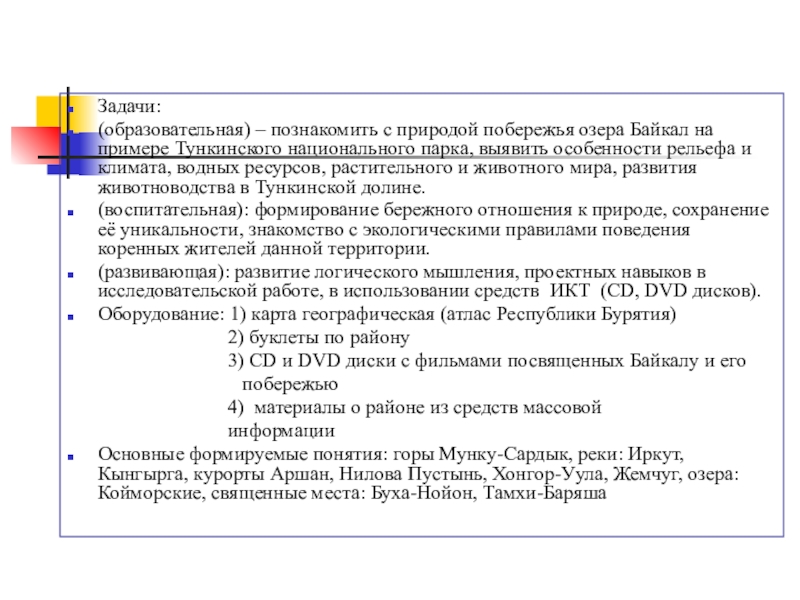 Цель: познакомить детей с особенностями уникальной природы побережья озера Байкал, на примере Тункинского национального парка