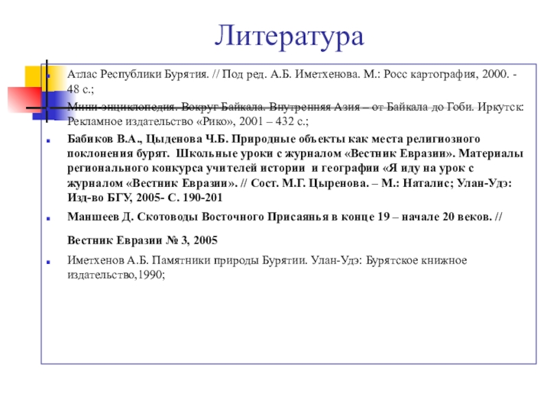 Бабиков В.А., Цыденова Ч.Б. Природные объекты как места религиозного поклонения бурят. Школьные уроки с журналом «Вестник Евразии». Материалы регионального конкурса учителей истории и географии «Я иду на урок с журналом «Вестник Евразии». // Сост. М.Г. Цыренова. – М.: Наталис; Улан-Удэ: Изд-во БГУ, 2005- С. 190-201