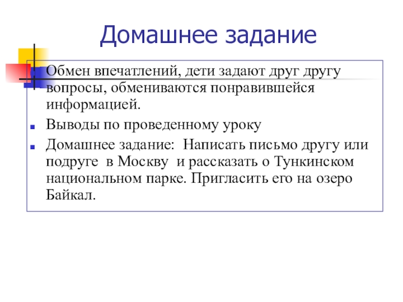 Домашнее задание: Написать письмо другу или подруге в Москву и рассказать о Тункинском национальном парке. Пригласить его на озеро Байкал.