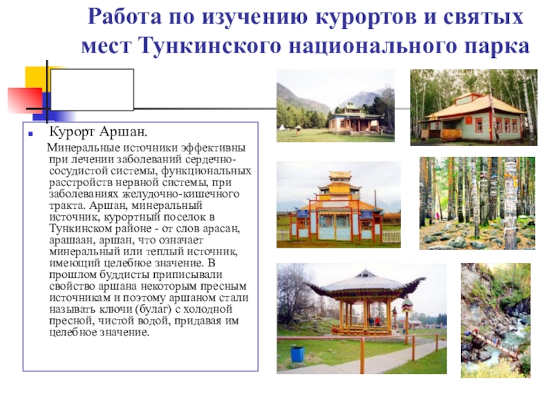 Слайд 10Работа по изучению курортов и святых мест Тункинского национального парка