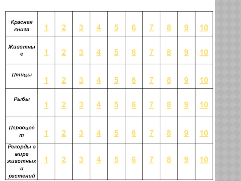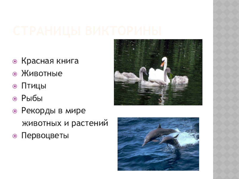 СТРАНИЦЫ ВИКТОРИНЫКрасная книгаЖивотныеПтицыРыбыРекорды в мире  животных и растенийПервоцветы