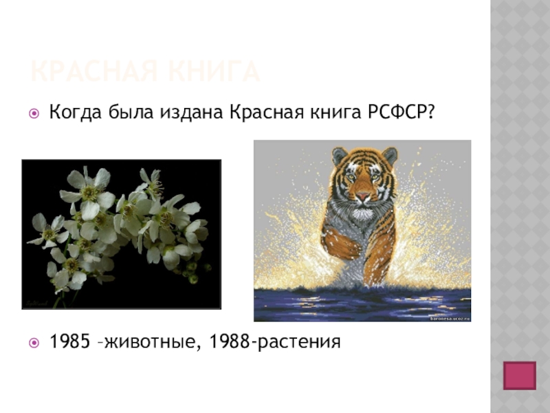 КРАСНАЯ КНИГАКогда была издана Красная книга РСФСР? 1985 –животные, 1988-растения